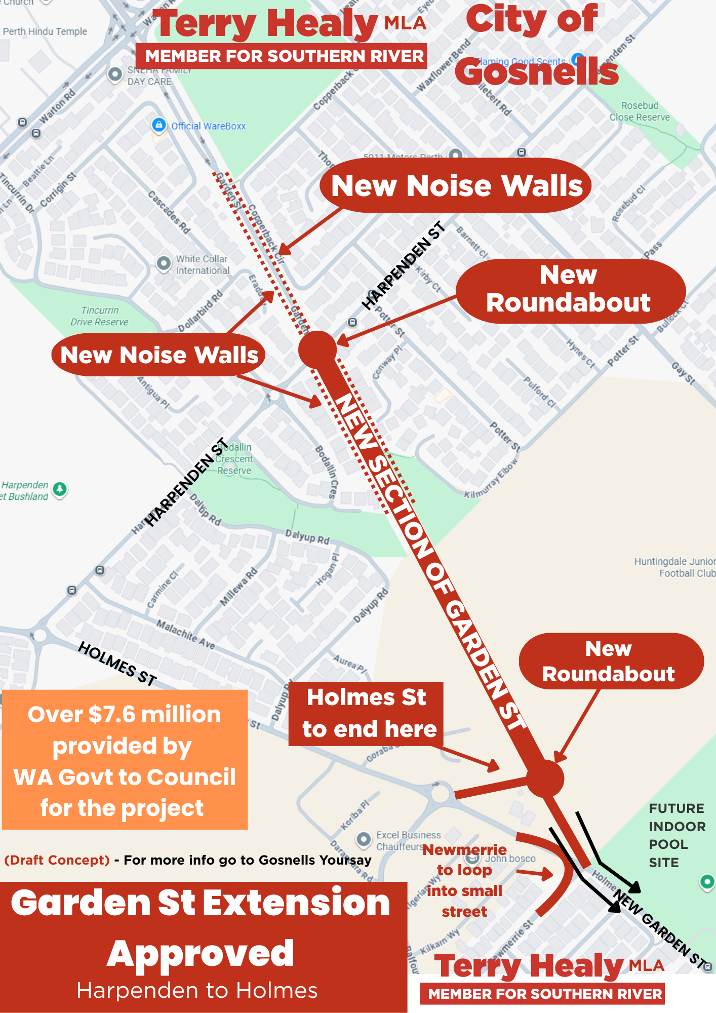 The Garden Street Extension (Harpenden to Holmes) has been approved in Huntingdale and Southern River.